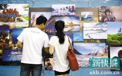 5月18日,观众在旅游馆内欣赏一家自助旅行网站展出的旅行摄影作品。