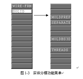 在实体造型环境下,将应用功能菜单翻至第二页,选择其中的MOLDPREPSEPARATE功能,可进行零件的实体分模,如图1-3所示。