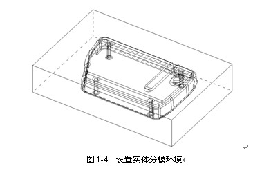 q        分模环境设置。通过选择MOLDPREP功能,按步骤完成分模零件的定义、收缩率的设置,并定义成型嵌件毛坯的形状、尺寸及相对于零件的放置位置,如图1-4所示。